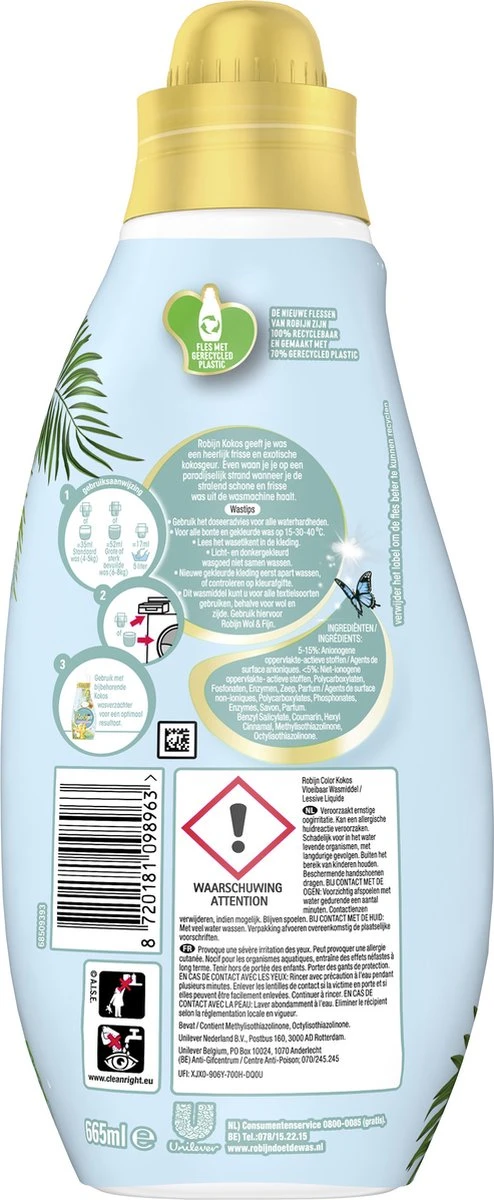 De verbeterde Robijn Kokos formule bevat 80% biologisch afbreekbare ingrediënten. We zijn op weg naar volledig biologisch afbreekbare formules. De vertrouwde effectiviteit en bekende geuren van Robijn, gecombineerd met de kracht van de natuur. Goed voor je kleding en beter voor de planeet. Bovendien zijn de flessen gemaakt van 100% gerecycled en 100% recyclebaar plastic. Op deze manier draagt Robijn bij aan een duurzamere manier van wassen.